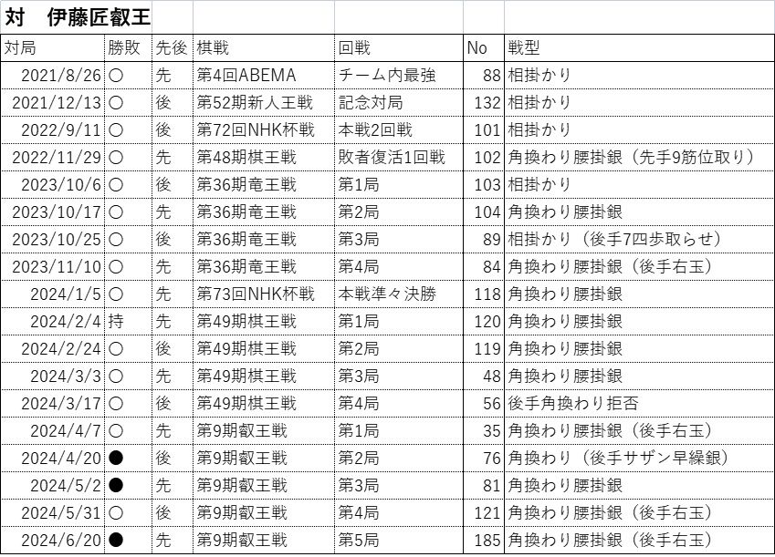 185局目 伊藤匠七段戦(2024年6月20日) 2024年08月13日 第9期叡王戦五番勝負 第5局(先手)藤井聡太叡王 VS 伊藤匠七段角換わり腰掛銀 (後手・右玉)ついに八冠・無敗タイトル防衛時代が終わる一戦。ですが、より一層ライバルとの激戦を繰り広げる藤井劇場第2幕の始まりかもしれません。最近は角換わり腰掛銀で、先手に▲4五桂と跳ねさせない後手の指し方が増えてきているのでしょうか?藤井先生必殺の▲6九玉~▲4五桂の将棋が激減しているように思えます。私は右玉に負けっぱなしですが…。この角が急所ですか!? < 前の記事次の記事 > コメント コメントフォーム 名前 コメント 記事の評価 リセット リセット 顔 星 情報を記憶 コメントを投稿する